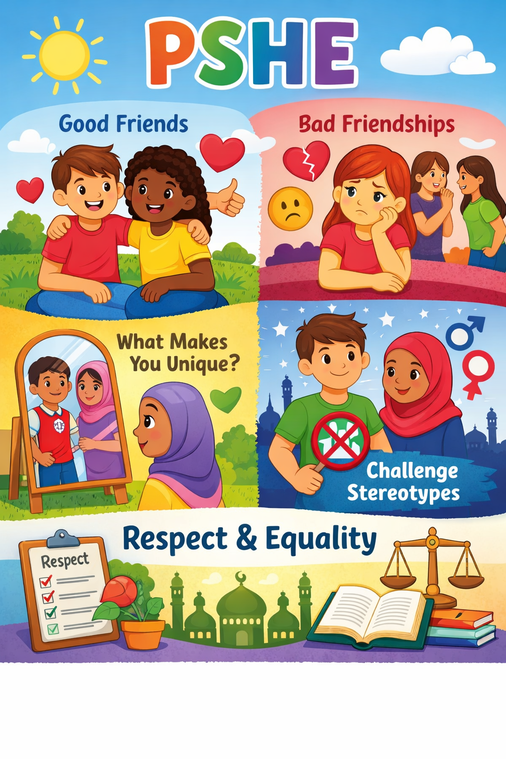 Children will develop their understanding of respect, including respecting others and authority, and create a respect checklist to guide their behaviour. They will also learn about stereotypes, including gender stereotypes, and how to challenge them. Links will be made to Islamic teachings about respect, equality and good character.
