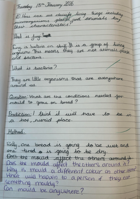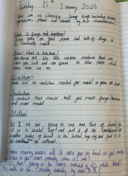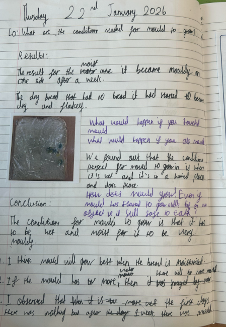 Over the week, Year 6 checked the bread daily, making detailed observations. They drew what the bread looked like on different days, wrote brief descriptions of the changes they noticed, and recorded questions that arose during the investigation in their science books. Year 6 discovered that mould grew on the damp bread but not on the dry bread, helping them to understand that moisture is an important condition for mould growth.